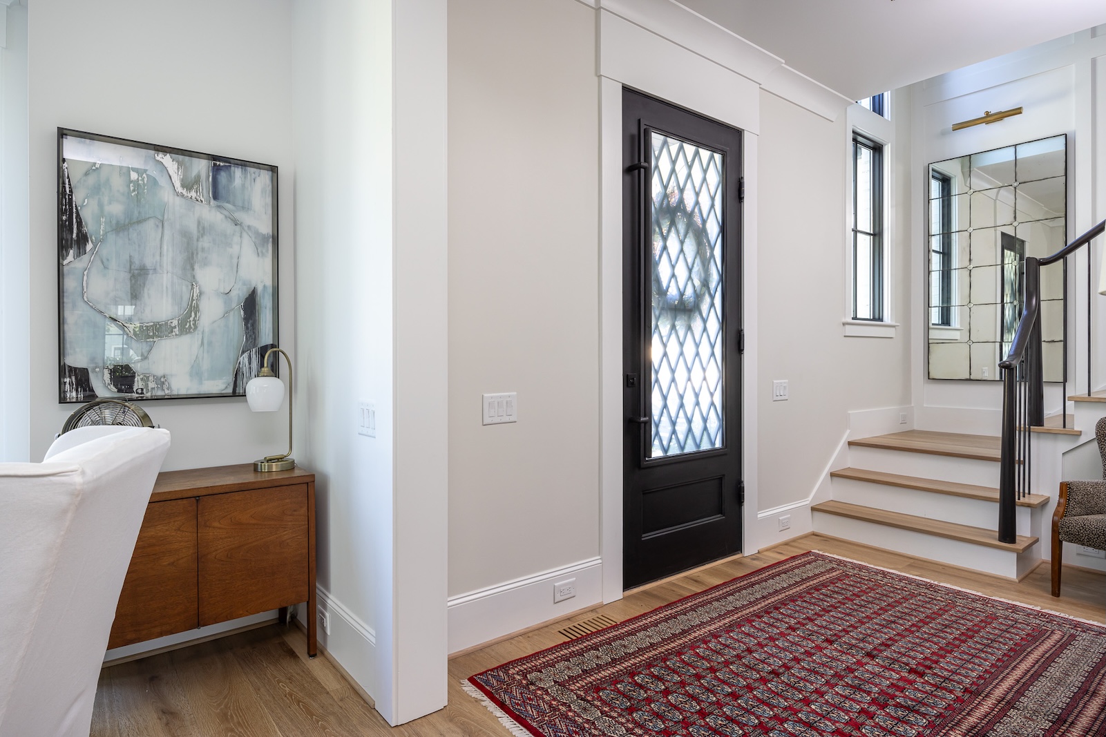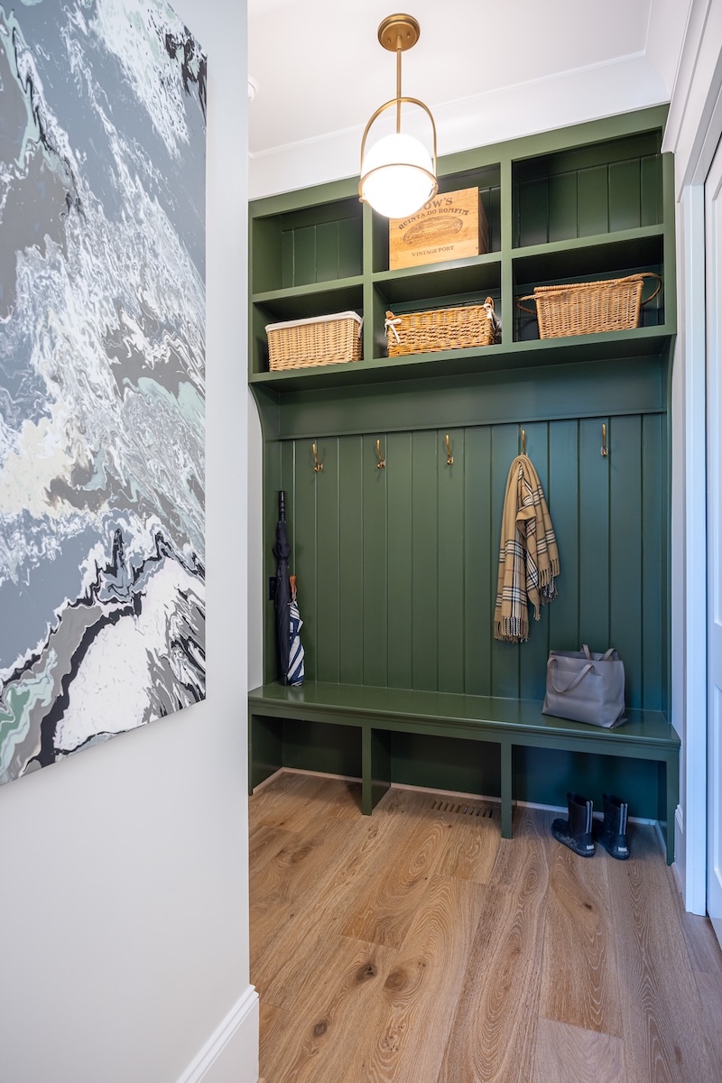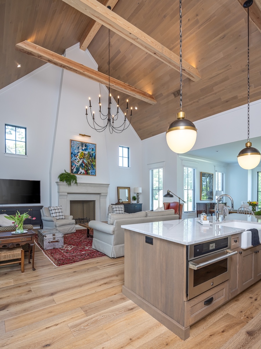 The conditioned crawlspace, energy-efficient systems, and hand-fitted custom cabinetry were integrated seamlessly, while signature features like the electrified glass front door, cathedral ceiling with exposed beams, and limestone fireplace surround came together exactly as planned.