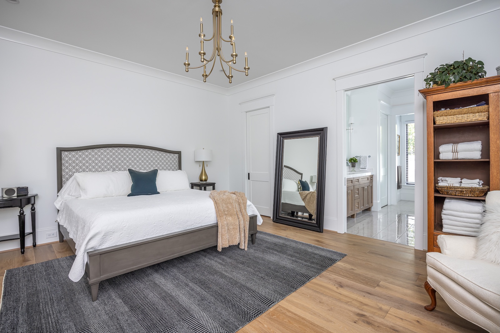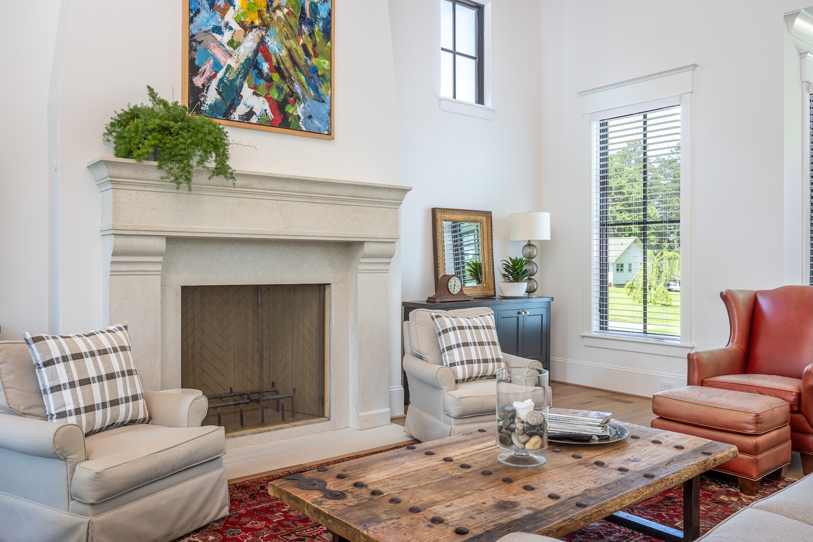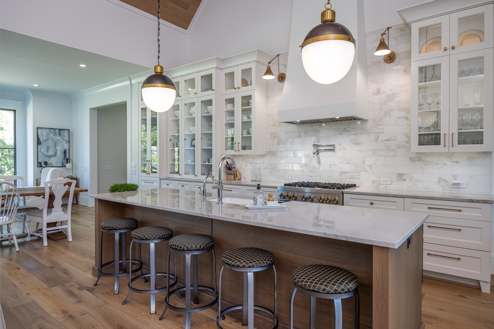 The conditioned crawlspace, energy-efficient systems, and hand-fitted custom cabinetry were integrated seamlessly, while signature features like the electrified glass front door, cathedral ceiling with exposed beams, and limestone fireplace surround came together exactly as planned.