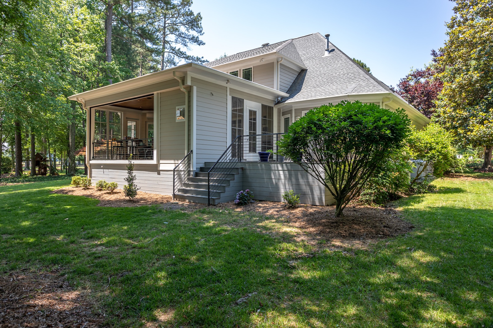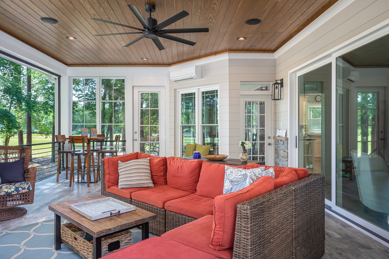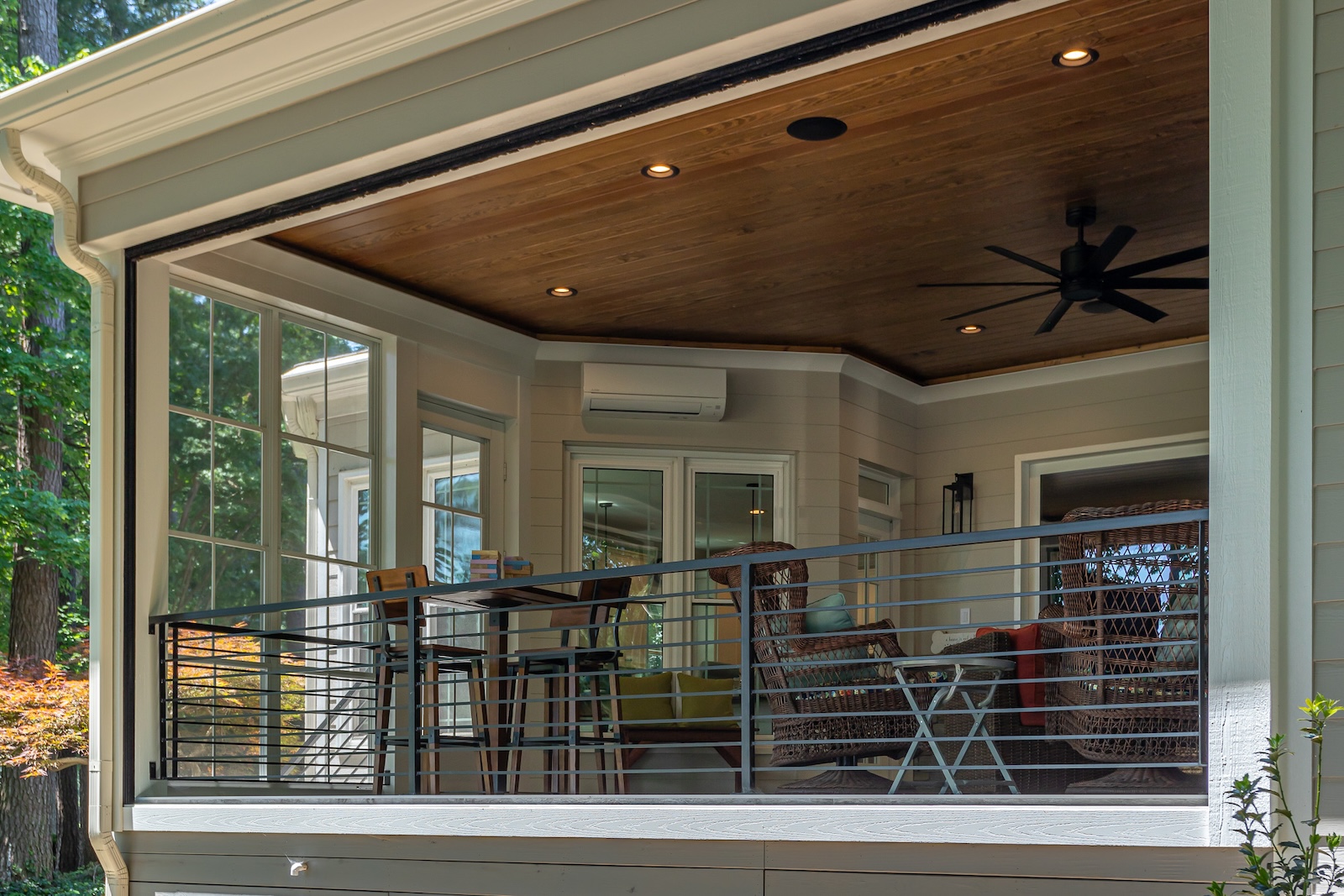 This project demanded major structural changes—removing the living room’s fireplace and windows, then lowering the original 18-foot downstairs ceilings to 9 feet to create an upstairs suite. Achieving the expansive porch view required rethinking the entire back wall of the home. Flat-roof engineering was essential to deliver 10-foot porch ceilings (12 inches higher than the downstairs ceilings) while staying within the original footprint. Balancing these structural modifications with preserving the home’s character was critical.