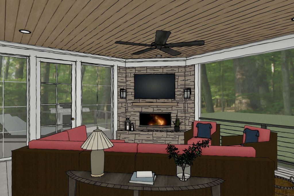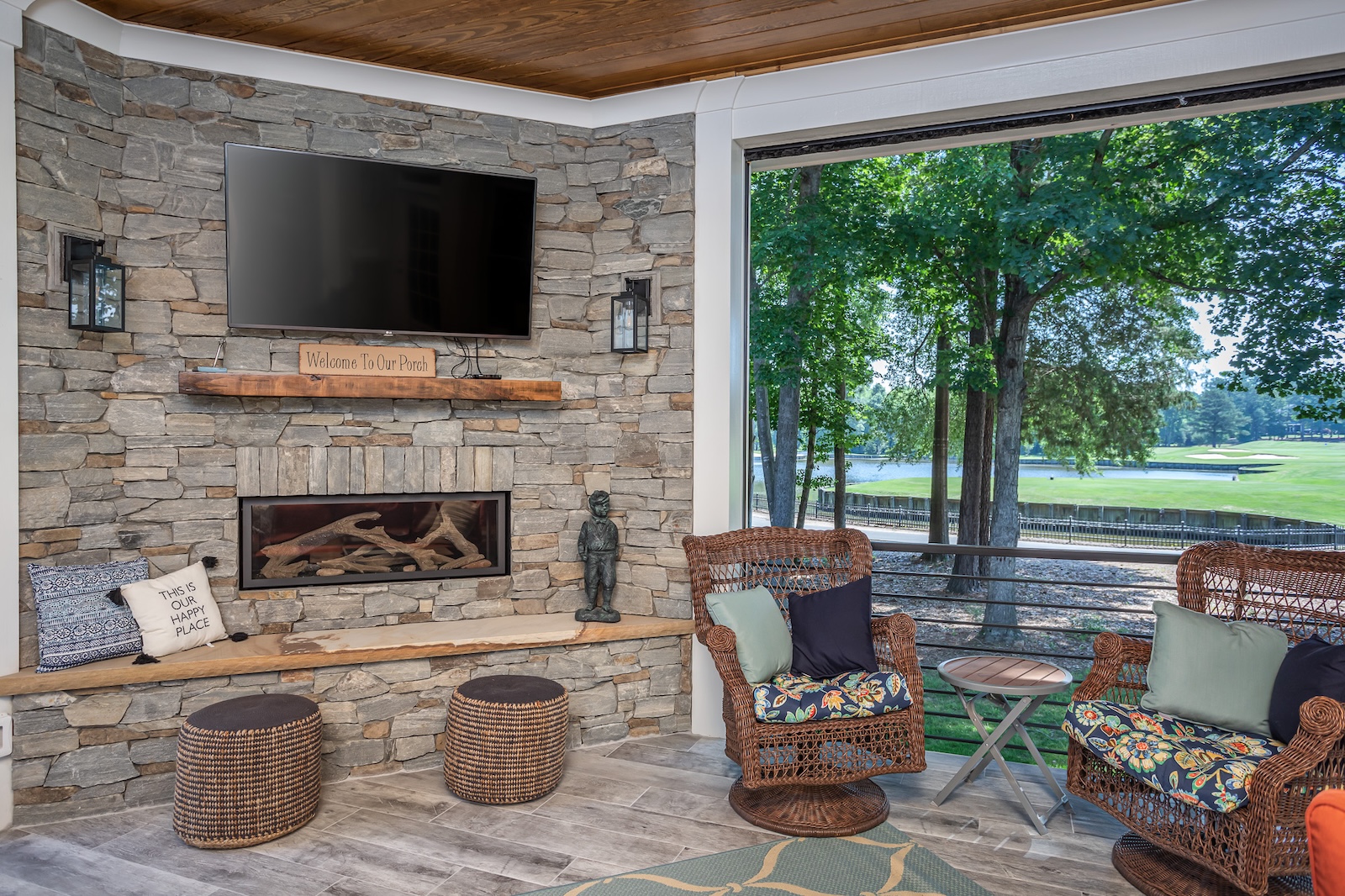 • Create a comfortable, all-weather porch with Phantom Screens, a raised fireplace, and a built-in sound system.